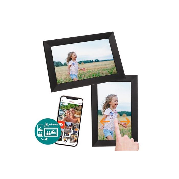 Erlebe pure Nostalgie mit dem Frameo HF-101B, einem modernen digitalen Bilderrahmen, der deine schönsten Erinnerungen auf einem beeindruckenden 10,1 Zoll IPS-Display zum Leben erweckt. Mit seinem edlen Look in stylischem Schwarz fügt sich der Frameo mühelos in jeden Wohnraum ein. Dieses Hightech-Gadget nutzt eine praktische Smartphone-App, mit der du und deine Familie Fotos kabellos hochladen könnt. Das intuitive Touchdisplay läuft auf einem vorausschauenden Android-Betriebssystem, das die Navigation kinderleicht macht. Mit gestochen scharfer HD-Auflösung von 1280 x 800 Pixeln genießt du gestochen klare und lebendige Darstellungen all deiner Lieblingsbilder. Das Display misst selbst 21,5 x 13,3 cm, mit Rahmen 26,3 x 18,3 cm, und der Rahmen ist nur 2,3 cm dick. Dank großzügigem Blickwinkel kannst du deine Fotos einfach aus jedem Winkel im Raum betrachten. Im großzügigen internen Speicher finden mehr als tausend Fotos Platz. Importiere oder sichere Bilder ganz bequem per microSD-Karte oder USB-Stick. Ob horizontal oder vertikal – dank des praktischen Standfußes steht der Frameo jederzeit sicher.