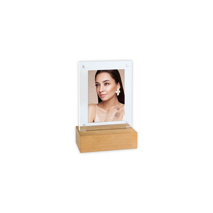 Der New York N Vertikal Acrylrahmen ist ein moderner 10×15 Rahmen mit Acrylplatten, Holzfuß und LED-Licht. Zeigt zwei Fotos gleichzeitig und lässt sich per Magnet einfach wechseln – ideal für Tisch oder Regal.