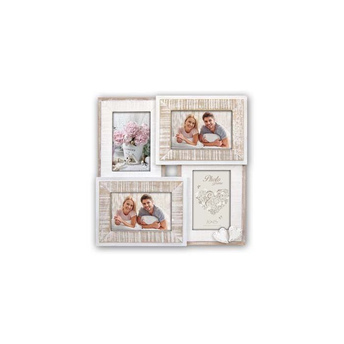 Der Zep Fotorahmen WW435 Molveno verwandelt jede Wand in deine persönliche, liebevolle Galerie. Dieser Holzrahmen bietet Platz für 4 deiner wertvollen Erinnerungen, jeweils perfekt gerahmt in 10x15 cm. Mit einem vintage-weißen und naturfarbenen Design sorgt der Rahmen durch die übereinanderliegenden Ebenen für einen verspielten Effekt. Die 3D-Herz-Dekoration hebt das Ganze auf die nächste Stufe. Ideal, um Liebe und besondere Momente zu feiern. Die Gesamtgröße des Rahmens beträgt 35x35 cm – ein echtes Highlight in deinem Zuhause.