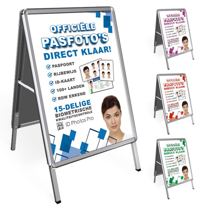 Dieses edle Gehweg-Schild mit einem stylischen silberfarbenen Metallrahmen ist die perfekte Möglichkeit, Passanten zu zeigen, dass du Passfotos machst. Durch seine große Größe ziehst du sofort die Aufmerksamkeit potenzieller Kunden auf dich. Dieses exklusive Design gibt es nur bei uns und kann auf Wunsch angepasst werden – so passt es perfekt zu deinen Wünschen.