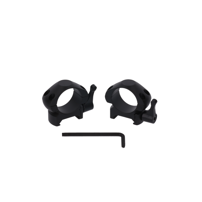 Um die Montageringe zu benutzen, löse zuerst die obere Ringhälfte vom Unterteil. Schraube die Klemme unten links auf, setze die Ringe auf die gewünschte Schiene und ziehe sie fest. Jetzt legst du dein Zielfernrohr auf die unteren Ringhälften, befestigst die oberen Hälften locker und richtest das Zielfernrohr aus. Dank des praktischen Hebels geht das Verriegeln und Entriegeln kinderleicht. Wechsle schnell das Zielfernrohr oder transportiere es sicher separat. Denk daran, die Schrauben mit einem Drehmoment von 1,5 bis 1,8 Newtonmetern fest anzuziehen für den besten Halt.