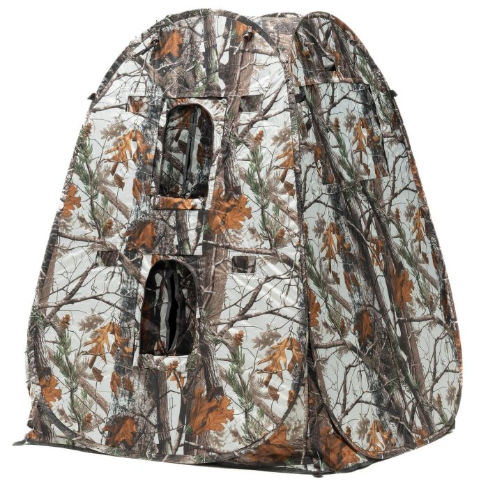 Möchtest du das Zelt noch besser in seine Umgebung einfügen? Befestige zusätzliche Tarnmaterialien wie Äste und Blätter mit den eingebauten Schnüren. Für noch mehr Abwechslung kannst du ein zusätzliches Tarnnetz verwenden. Achte immer darauf, dass die Sicht rundum frei bleibt – so gelingen dir die besten Fotos. Das Zeltmaterial aus Polyester 150D verspricht eine lange Lebensdauer, auch wenn intensive Sonneneinstrahlung das Tarnmuster etwas verblassen lassen kann. Dank der 2.500 mm Wassersäule bleibt der Innenraum auch bei Regen trocken, wobei die Witterungsbeständigkeit bei langanhaltendem Gebrauch etwas abnehmen kann.