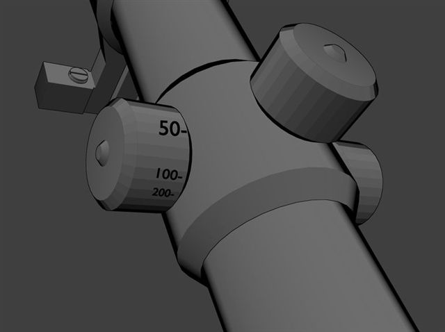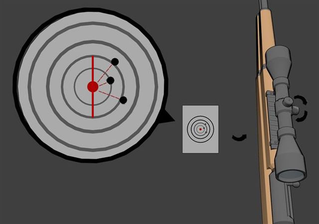 Eerst gaan we de breedte instelling aanpassen, deze bevindt zich aan de rechterzijde van de richtkijker. Zoom maximaal in op het doel en stel scherp. Vervolgens zoomt u uit naar 4x vergroten en vuurt u een schot af op het midden van de verticale lijn. Hierna vuurt u nog twee schoten of om een goede indicatie van de afwijking te krijgen. Vervolgens bepaalt u de gemiddelde afwijking naar links of rechts ten opzichte van uw doel. Deze afwijking gaan we corrigeren met de breedte instelling. Afhankelijk van de richting die de afwijking heeft draait u de breedte instelling een aantal tikjes (bijvoorbeeld 5) naar links of rechts. Tot slot vuurt u weer drie schoten af en bepaalt u wederom de gemiddelde afwijking voor de laatste correctie tot de schoten de verticale lijn raken.