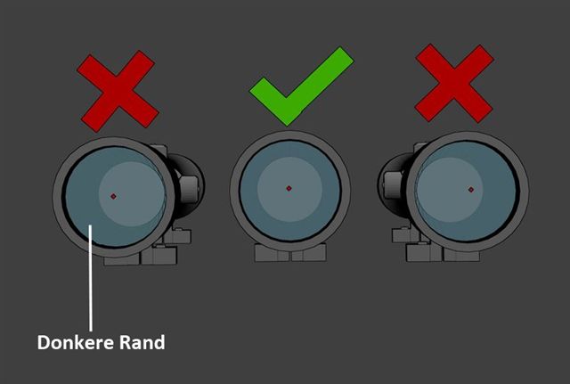 Tip. Kijk op een iets andere afstand door de richtkijker zodat de zwarte randen rondom het dradenkruis zichtbaar zijn. Kijk nu zo door de richtkijker totdat de rand rondom het dradenkruis overal gelijk is.