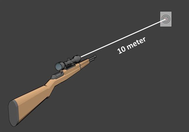 Allereerst pak je een A4 papier en trek hierop een verticale lijn van circa 15 cm. Bevestig het op de doelplaat (min 2 cm dik en 1x1 meter groot). Ongeveer 10 meter hiervandaan plaats je een tafelt en kruk. Om je wapen aan de voorzijde te ondersteunen gebruik je een kussen of zandzak.